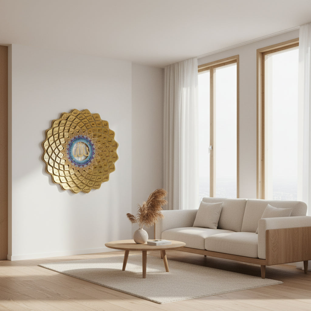 Make any room a place of peace with the 99 Names of Allah in exquisite Arabic calligraphy. This piece serves as both spiritual reminder and modern statement, ideal for living rooms and prayer corners alike.